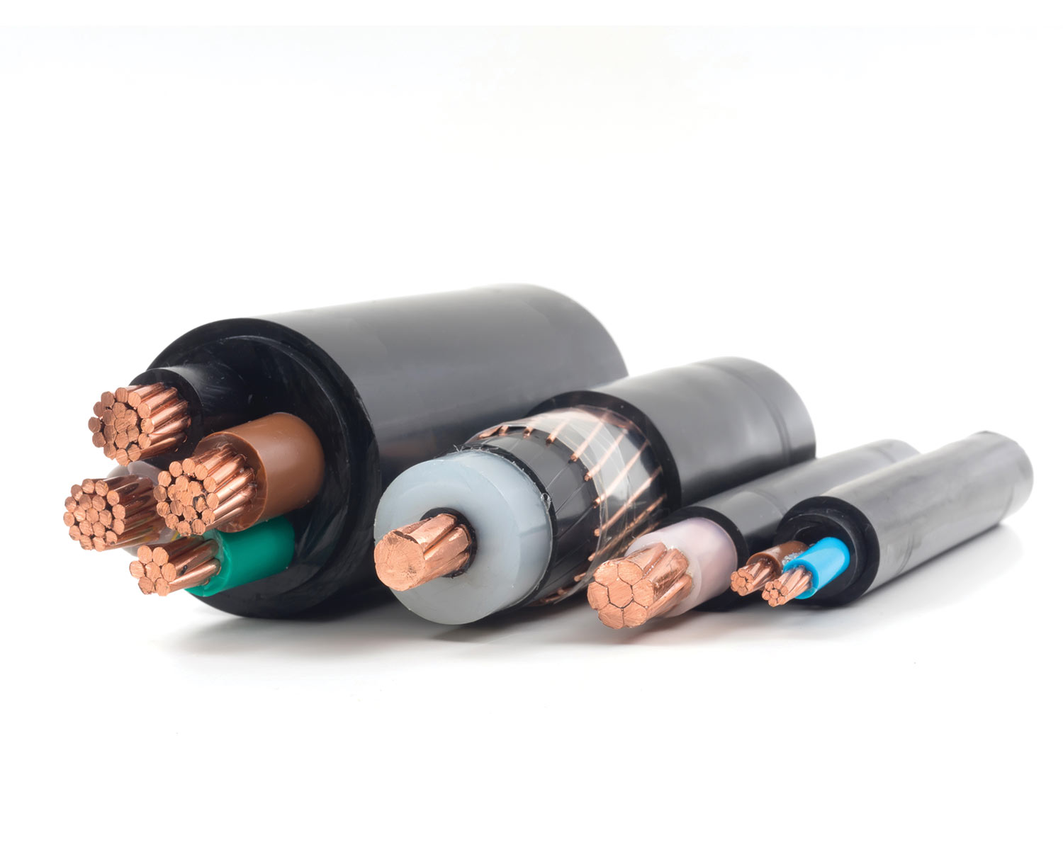 • Medium Voltage Cables – Both the Aluminum and Copper MV Series are rated 35kv; they feature tree-retardant cross-linked polyethylene (TR-XLPE) insulation and a cross-linked polyethylene (XLPE) jacket. The cable is designed for use in three-phase systems with voltage not exceeding 35,000 volts phase to phase and conductor temperatures not exceeding 105°C for normal operation. Suitable for direct burial.